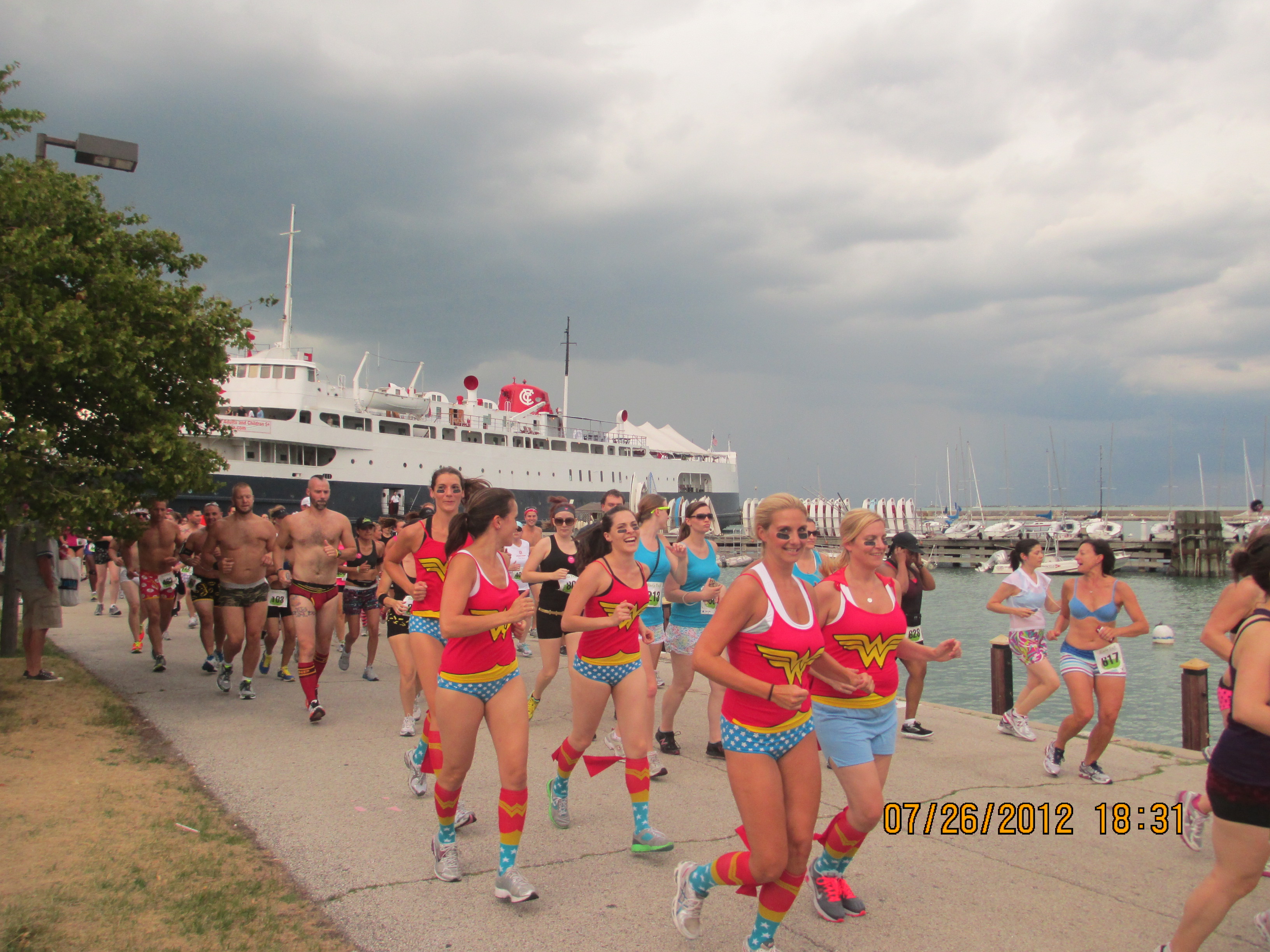 It ‘s that time of year again. A time in which people from miles away converge on the city of Chicago to run 3.1 miles in their underwear. This was the 2nd annual Undie Dash and this years turnout was amazing. Weather conditions were hot and humid and the course was laid out along Monroe Harbor’s beautiful lakefront. Some participants dressed in undie based costumes while others participated in standard tighty whities. As the following image files will show, runners have great imaginations and know how to have a good time. This year the “after” party was held onboard a docked ship with music, dancing, food and a full bar. It is an event that must be seen in person to be believed. If you didn’t attend, the next best thing is the gallery of pictures that I have compiled of the “Undie Dash & Bash” that were taken by me and my friends Jeff and Lisa. Although, I must give credit where credit is due and inform you that a portion of the pictures at the end are from the Undie Dash Facebook Page. My apologies to any of you who were kind enough to pose for pictures but were not included in the gallery. 90% were very clear but the remaining 10% were not good enough quality to be posted. So without further ado, I give you the 2012 Undie Dash 5k image gallery.